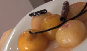D’abord, préparez les pêches en les pochant dans un mélange d’eau bouillante et du sucre ; on peut aussi y ajouter un peu de jus de citron. Plongez les pêches dans le sirop pendant 10 minutes, puis épluchez-les. Une fois épluchées, on va les remettre dans ce sirop de sucre pendant 1 petite heure et les laisser confire. Lorsque les pêches sont prêtes (bien cuites, bien imbibées), coupez-les en quartiers réguliers.