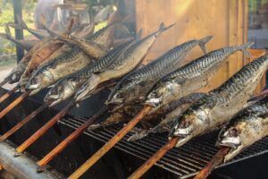Vient, enfin, le moment du séchage. Les cuisiniers peuvent, au choix, fumer leurs filets dans un fumoir ou les cuire au feu de bûches après les avoir embrochés.