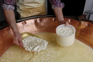 En effet, c’est grâce aux présures naturellement présentes dans la panse animale utilisée que le lait se transforme en lait caillé puis en petit-lait. Une fois égoutté et séché le petit-lait devient un aliment facile à transporter et nourrissant : le fromage !