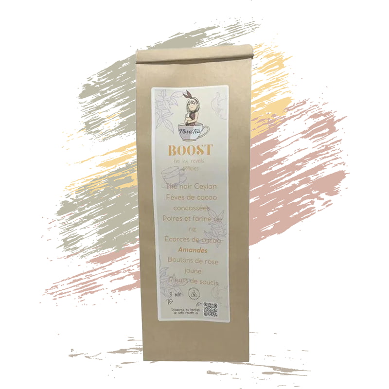 Le Thé noir « Boost » est un thé fort en bouche par le thé noir et doux par le chocolat. Réveillez-vous de bonne humeur grâce à ce beau thé noir énergisant.